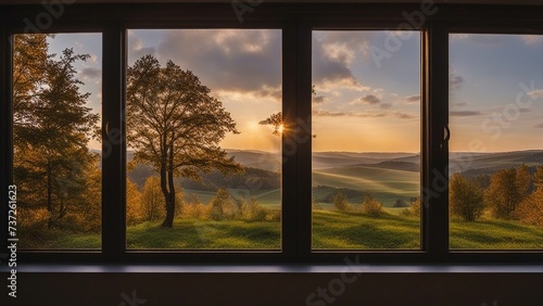 © Jared, Fototapeta premium sunset in the city a window with a view of the mountains at dusk