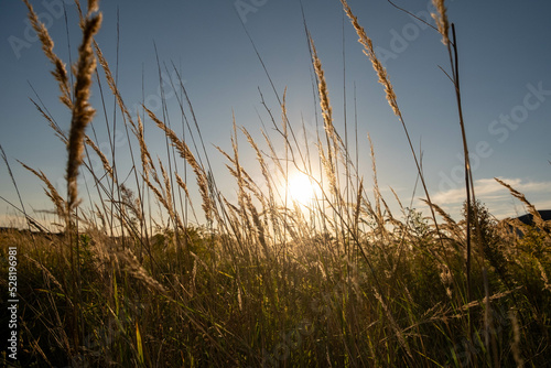 © Сергей Радченко, Obraz premium Sunset in the field. Ears of grass close-up. Dry grass close up. Spikelets against the blue sky. The rays of the sun pass through the ears.