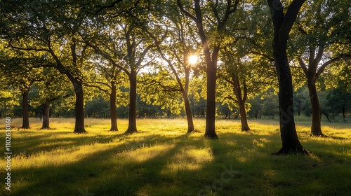 © atar, Naklejka premium Sunset in the forest. Golden hour light through trees.