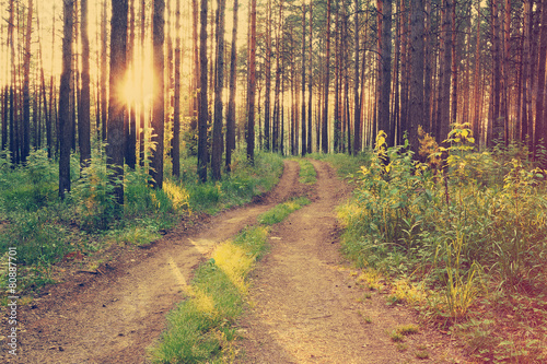 © vlntn, Obraz premium sunset in the forest, instagram retro style
