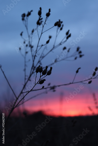 Fototapeta premium sunset in the forest. the sun is covered with a fluffy dry branch. beautiful landscape.
