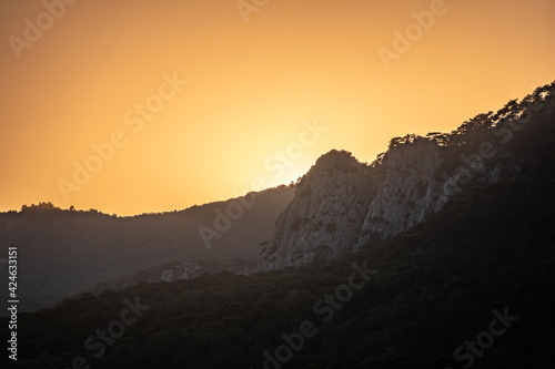 © Dmitrii Potashkin, Fototapeta premium Sunset in the mountains among the green trees