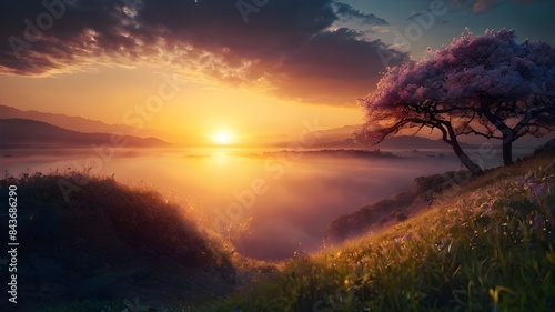 Fototapeta premium sunset in the mountains, beautiful sunrise, fantasy-like. Generative AI