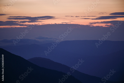 Fototapeta premium sunset in the mountains line of blue beautiful mountains