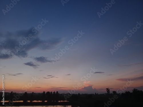 © Aarohan, Obraz premium sunset in the village, blue sky, trees, clouds in the sky