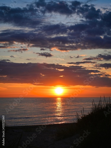 Naklejka premium Sunset into the ocean. Blue clouds contrast with orange sunrays.