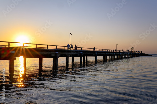 Fototapeta premium Sunset jetty silhouette, Kingfisher Bay, K'gari Queensland, coastal lifestyle, fishing camping weekend summer holiday vacation