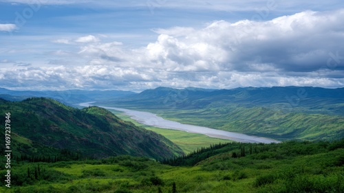 Obraz premium Sunset kayaking in valley river view under dramatic cloud sky over green...