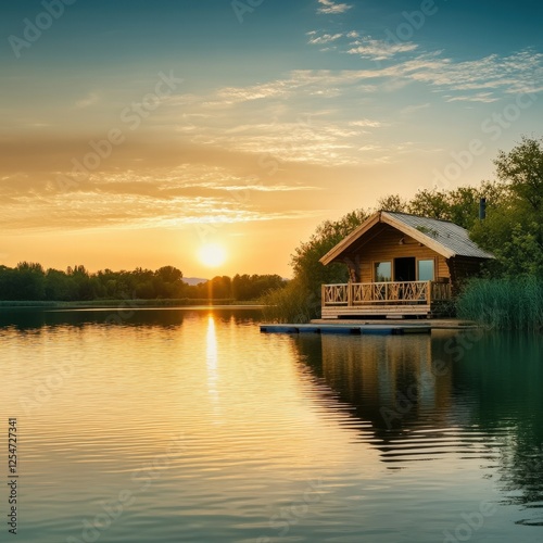 © Diio, Fototapeta premium Sunset Lake Cabin Retreat