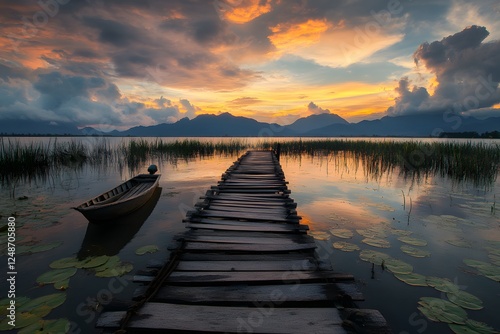 © Abdi, Fototapeta premium Sunset lake pier, boat, mountains, calm, serene, travel postcard
