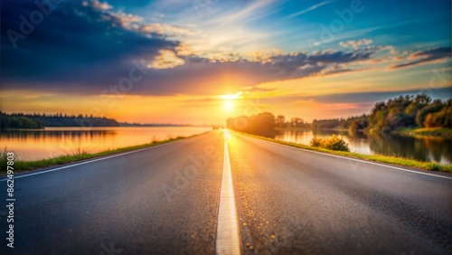 © N7, Naklejka premium Sunset Lake Road Blur: A serene blurred background of a lake and road at sunset, with the warm glow of the setting sun reflecting on the water.