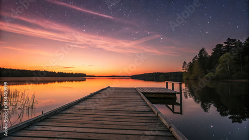 © hussain-01, Fototapeta premium Sunset lake view from a wooden dock with stars appearing