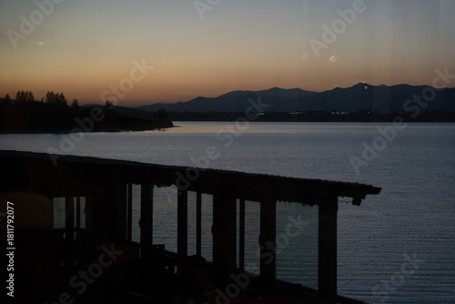 Obraz premium Sunset lake view from veranda with reflections.