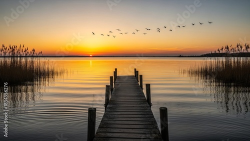 © syukri, Fototapeta premium Sunset landscape featuring a serene lake with smooth reflective water
