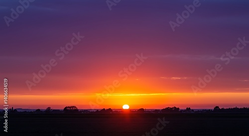 © zerostudio.id, Fototapeta premium Sunset Landscape: Fiery Horizon, Silhouetted Trees, Serene Evening