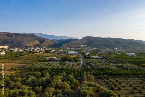 Naklejka premium Sunset landscape with olive trees and tiny mountains, Greece, Crete
