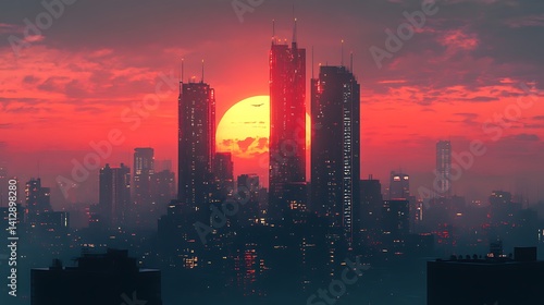 Fototapeta premium Sunset light captures tall cityscape mirrored across smooth lake high...