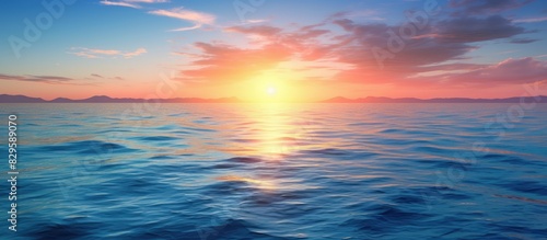 © Ilgun, Fototapeta premium Sunset light illuminates the surface of the deep blue sea with a captivating view that offers a peaceful and tranquil setting for a copy space image