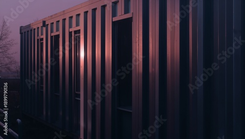 © olegganko, Obraz premium Sunset Light Reflects on a Metallic Building Located in an Urban Area During Twilight Hours