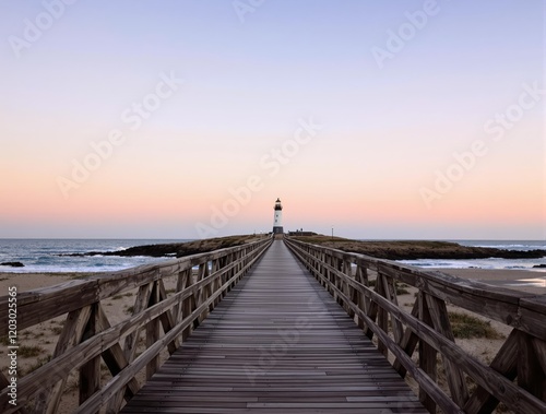 © 'Azyyati, Obraz premium Sunset Lighthouse Seascape Wooden Walkway Bridge to Ocean