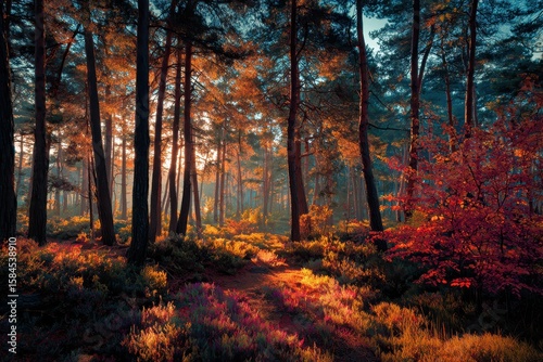 © LimeSky, Fototapeta premium sunset lit autumn forest scene