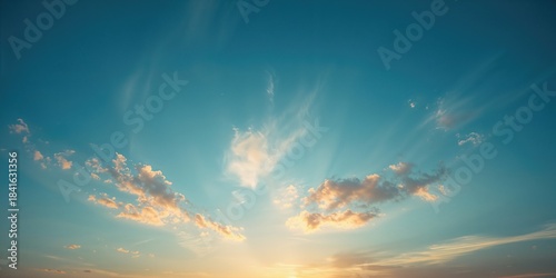 Naklejka premium Sunset-lit blue sky with subtle cloud formations, ideal for nature scene...
