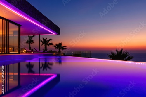 Fototapeta premium Sunset luxury villa pool, ocean view, night lighting, relaxation