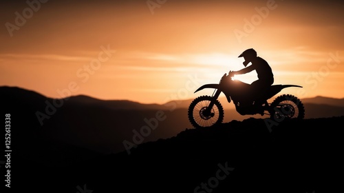 Naklejka premium Sunset Motocross Rider Silhouette, Mountain Peak