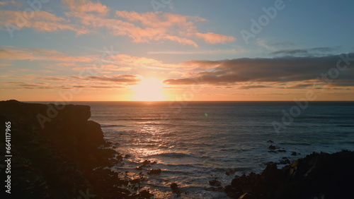 Fototapeta premium Sunset mountain hill silhouette sea coastline. Drone view dark cliffs calm ocean