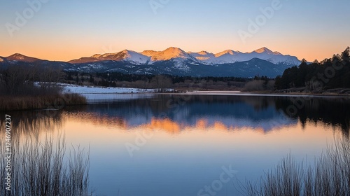 © creativeideh, Fototapeta premium Sunset mountain lake reflection panorama