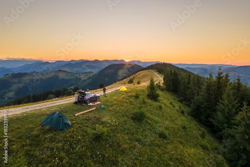 © bilanol, Fototapeta premium Sunset mountain landscape with tourist camping tents and a SUV car on hillside campsite at bright sunny evening. Offroad adventure