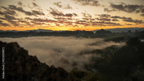 Fototapeta premium Sunset mountain range beautiful landscape mist foggy sunrise beam. Golden sky Mountain landscape foggy windy mountain. Amazing Landscape cloud sky on sunrise. Countryside gold sunlight heaven scene