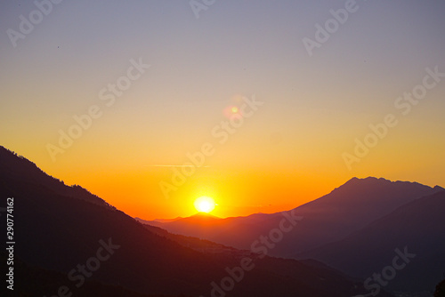 © Yulia, Fototapeta premium Sunset mountain valley hills landscape. Mountain valley sunset panorama.