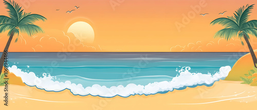 Obraz premium Sunset on a beach with palm trees and ocean waves.