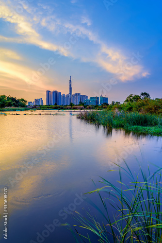 © ducvien, Naklejka premium Sunset on a flooded field in Hochiminh City, Vietnam.