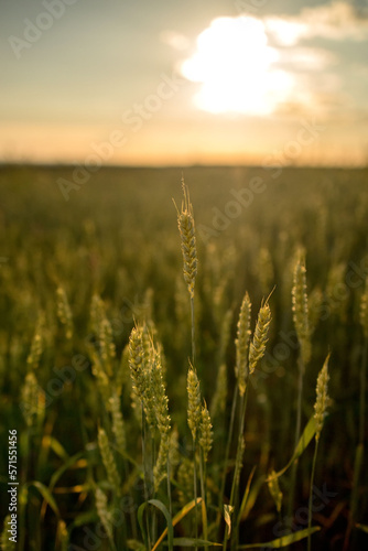 © volody10, Obraz premium Sunset on a green wheat field. Future harvest. A field of ears of corn