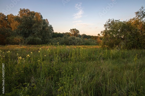 © Iryna, Obraz premium Sunset on a meadow over the river