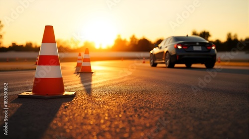 © Danish, Naklejka premium sunset on a racetrack with three orange and white traffic cones on the left, a sleek, black sports car speeding on the right,