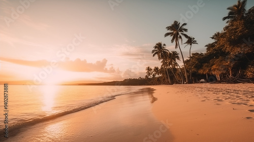 Fototapeta premium Sunset on a tropical beach with palm trees and calm ocean water view