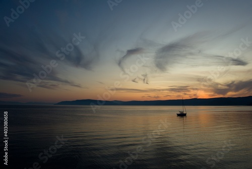 © Tom, Naklejka premium Sunset on Baikal lake with sun setting down behind the mountain and sun rays