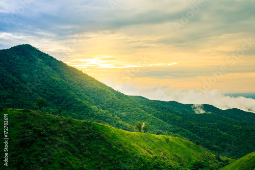 Fototapeta premium Sunset on mountain with fog after rain in Phrae Northen Thailand