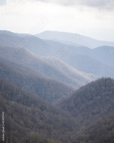 © Justin Mueller, Naklejka premium sunset on mountains in the spring fog