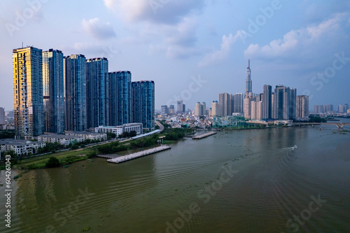 Naklejka premium Sunset on Saigon river, Ho Chi Minh city, Vietnam