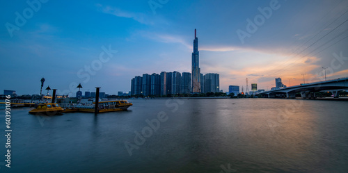 Naklejka premium Sunset on Saigon riverside, Ho Chi Minh city Vietnam. Photo taken on May 2023