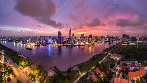 Naklejka premium Sunset on Saigon riverside, Ho Chi Minh city Vietnam. Photo taken on May 2023