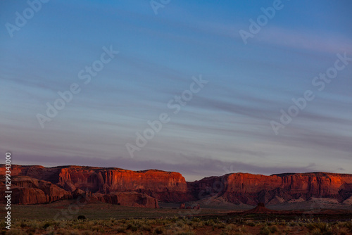 © Logan, Fototapeta premium Sunset on sandstone buttes in the desert of Monument Valley, in Arizona and Utah.