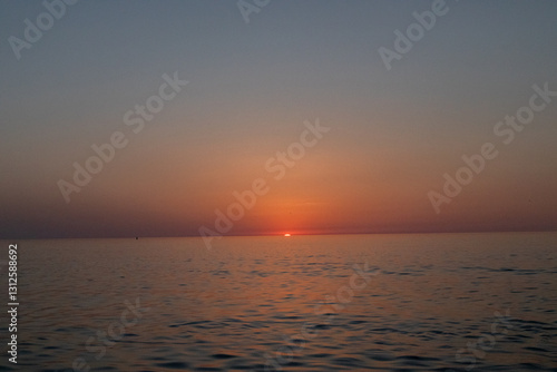 © KATSIARYNA PALTARACH, Naklejka premium sunset on sea sky background, sunset sky, clouds over sea in evening with orange, yellow sunlight in golden hour