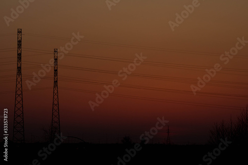 © Olga, Fototapeta premium Sunset on the background of the road and antennas. Beautiful landscape. Background.