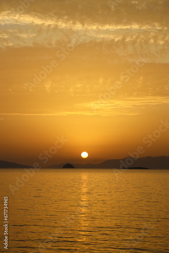 © bt1976, Naklejka premium sunset on the beach. Seaside town of Turgutreis and spectacular sunsets. Selective Focus.