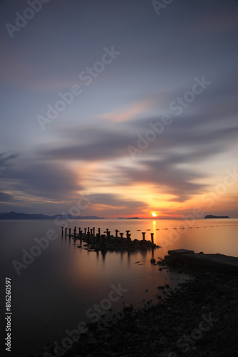 © bt1976, Naklejka premium sunset on the beach. Seaside town of Turgutreis and spectacular sunsets. Selective Focus. Long Exposure shoot. tranquility scene.
